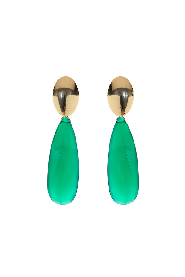 Chic 14k gold-filled large studs with green onyx teardrop gems hanging. Elegant enough for any special occasion.