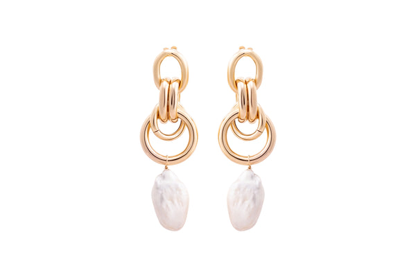 These statement earrings showcase an intricate gold filled ring design, with a white freshwater pearl pendant to soften the look.